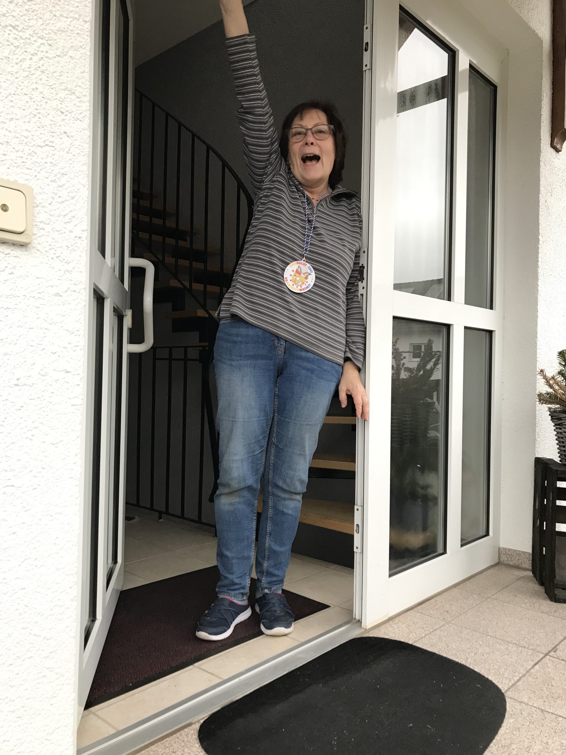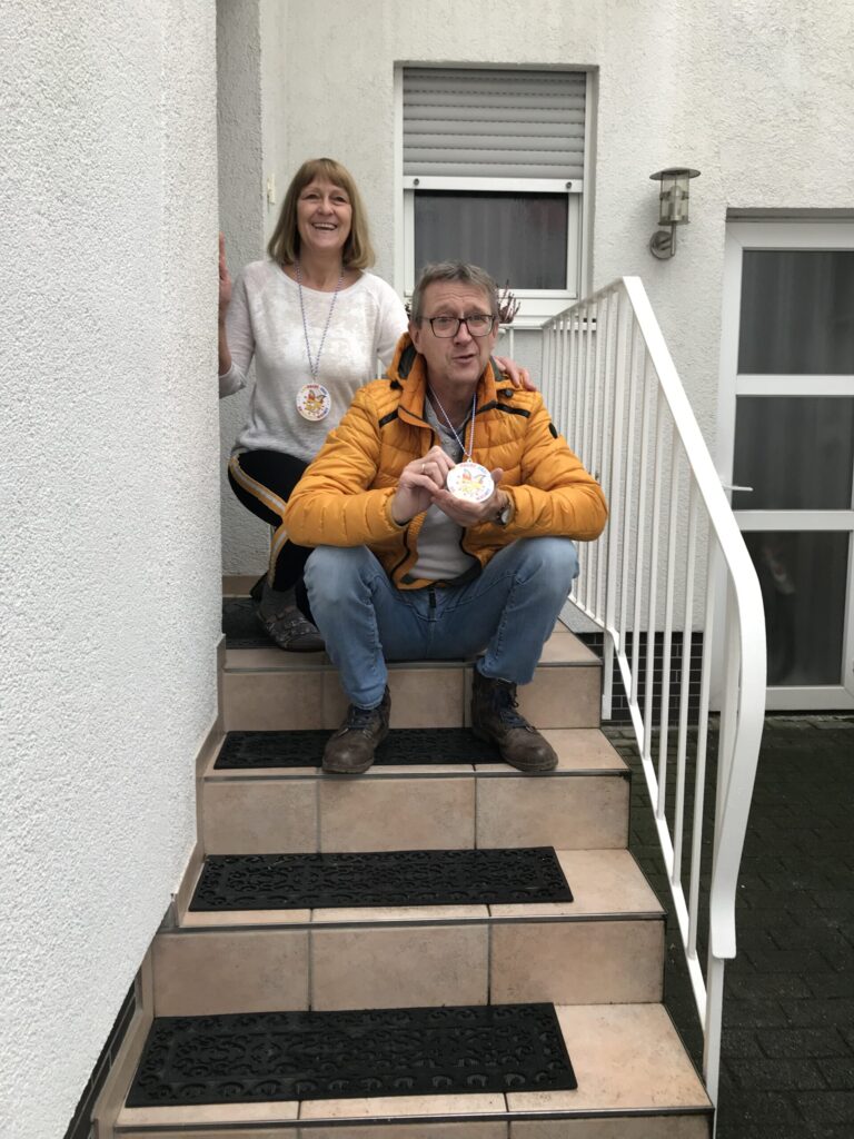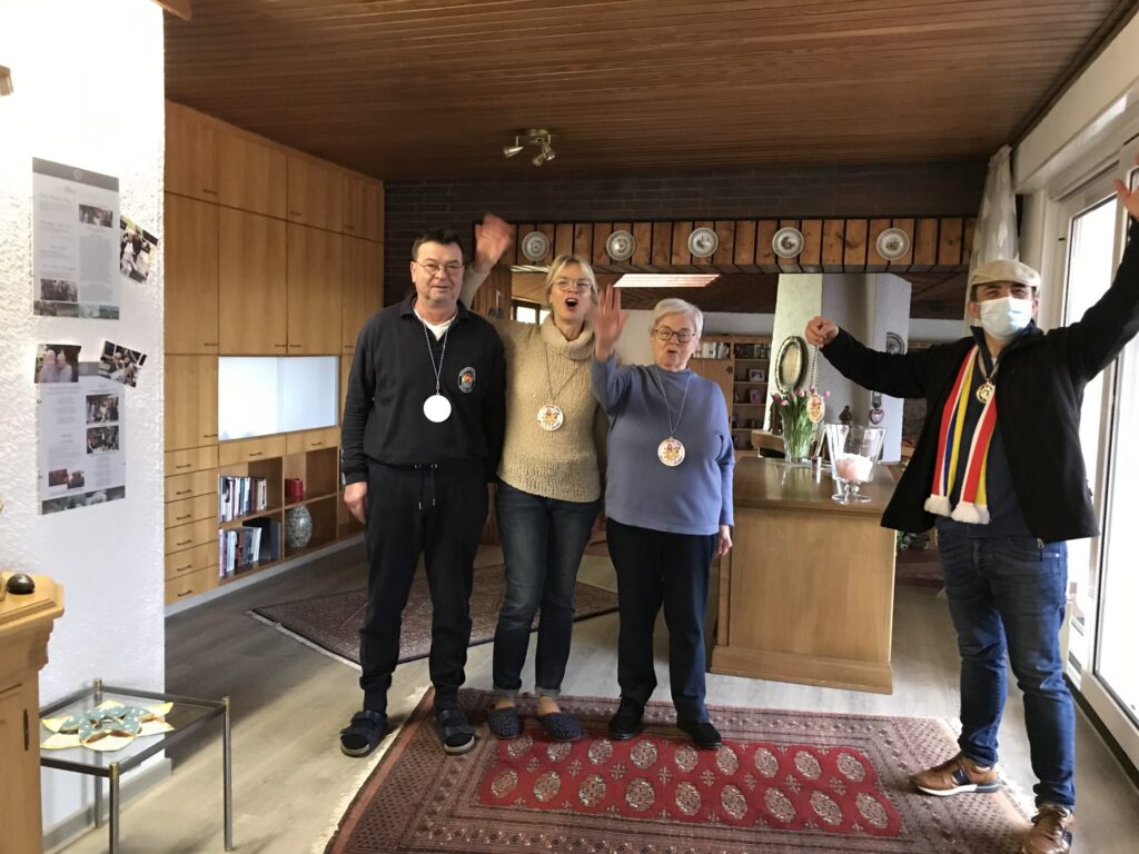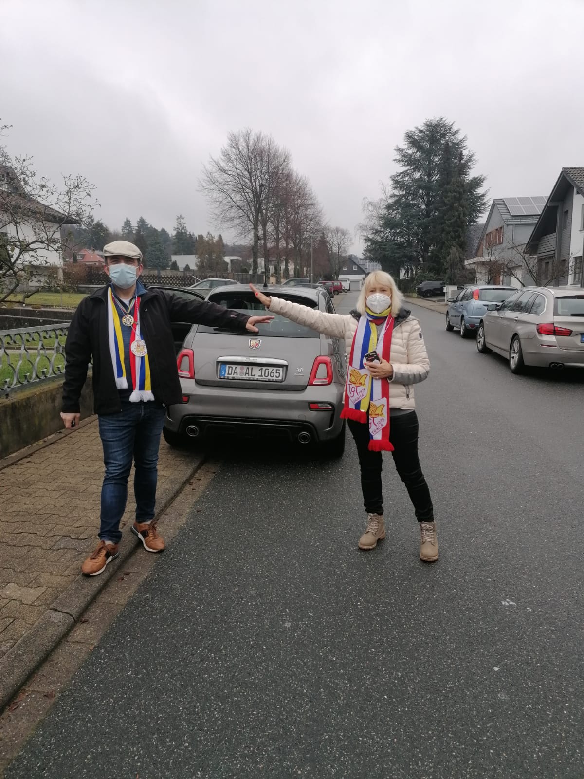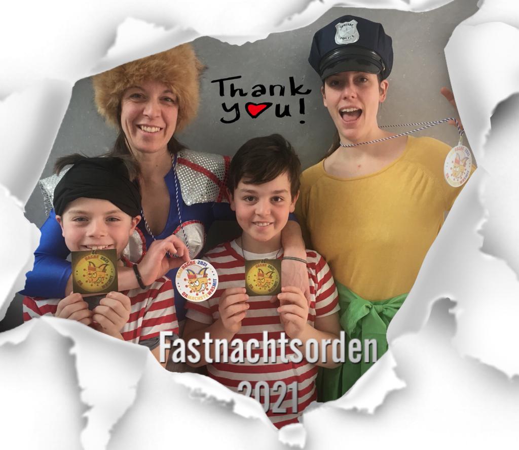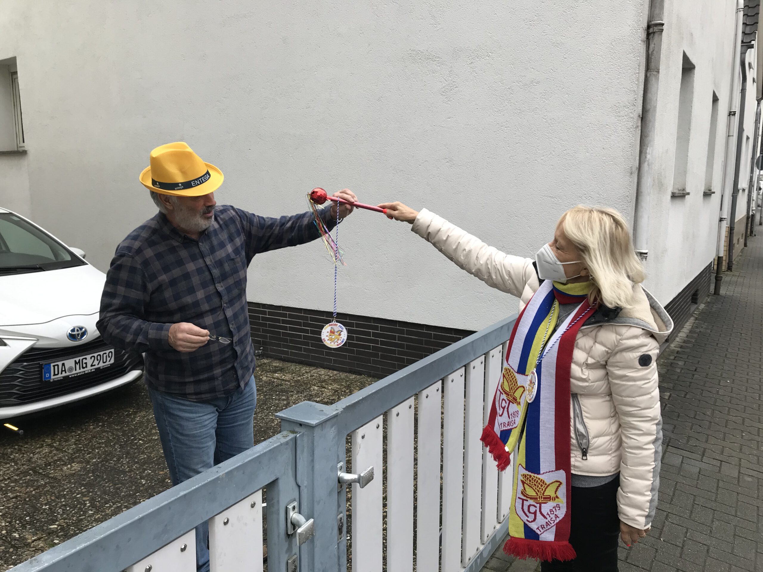 Mit viel Abstand hat dann 2021 die Fastnacht von Wohnzimmer zu Wohnzimmer unter dem Motto „Da machte was mit!“ stattgefunden. Natürlich durfte hierbei auch der obligatorische Fastnachtsorden nicht fehlen. Daher wurde eben ein Solcher eigens für dieses merkwürdige Jahr entworfen. Mit Abstand und Maske wurden diese Corona konform von der Leiterin der Abteilung Karneval -Marion Bickelhaupt- sowie dem Vereinsvorsitzenden und langjährigen Sitzungspräsidenten – Civito Carroccia- und unserer Übungsleiterin Alexandra Diehl und deren Tochter Mariella vor dem Faschingssamstag an die Mitglieder der Abteilung kontaktlos mit einem Stab überreicht. Die Resonanz auf die Haustüraktion war durchweg positiv. Alle waren total überrascht. Die Kinder und Jugendlichen bekamen zusätzlich ein kleines „Fastnacht-at-Home-Care-Paket“. Dieses bestand unter anderem aus einer roten Nase, einer kleinen Tröte und etwas Süßem. Insgesamt wurden 230 Orden verteilt. Ein großer Dank von der Abteilung gilt dem Elferratsmitglied Michael Heppenheimer, der die Orden entworfen, gefertigt und gesponsert hat.