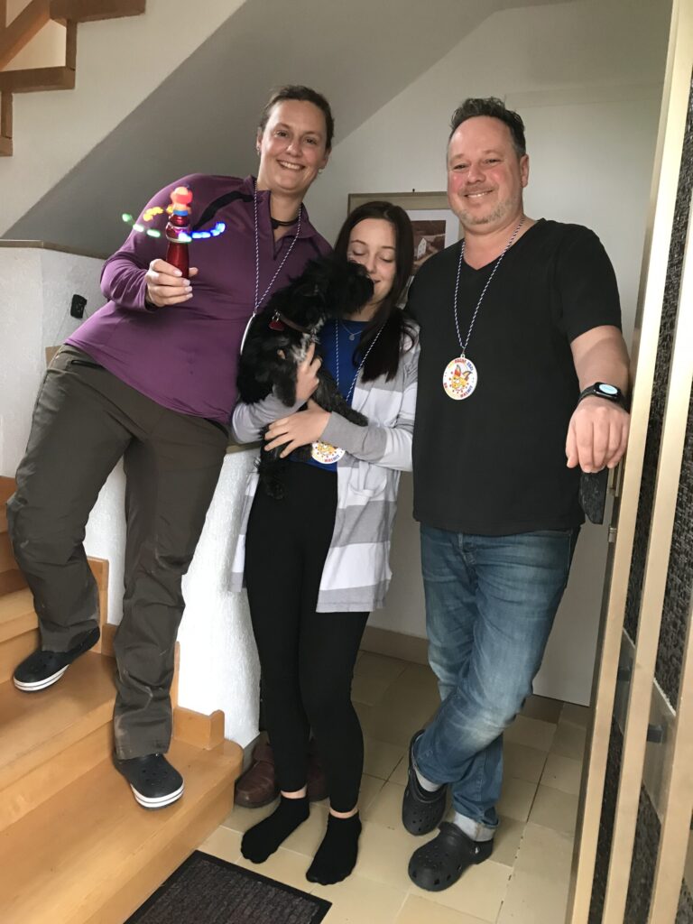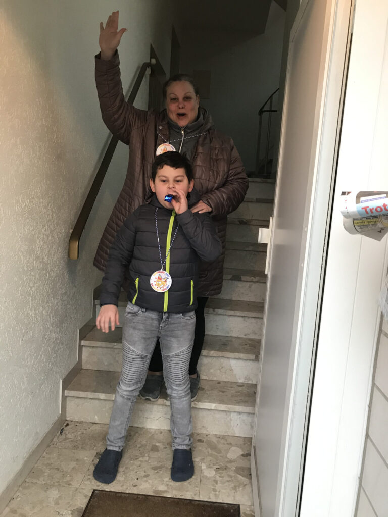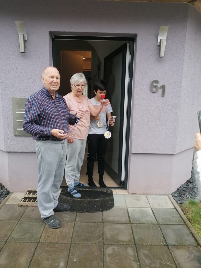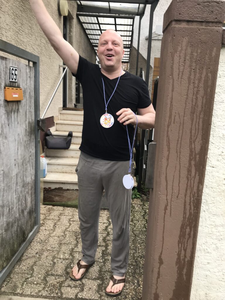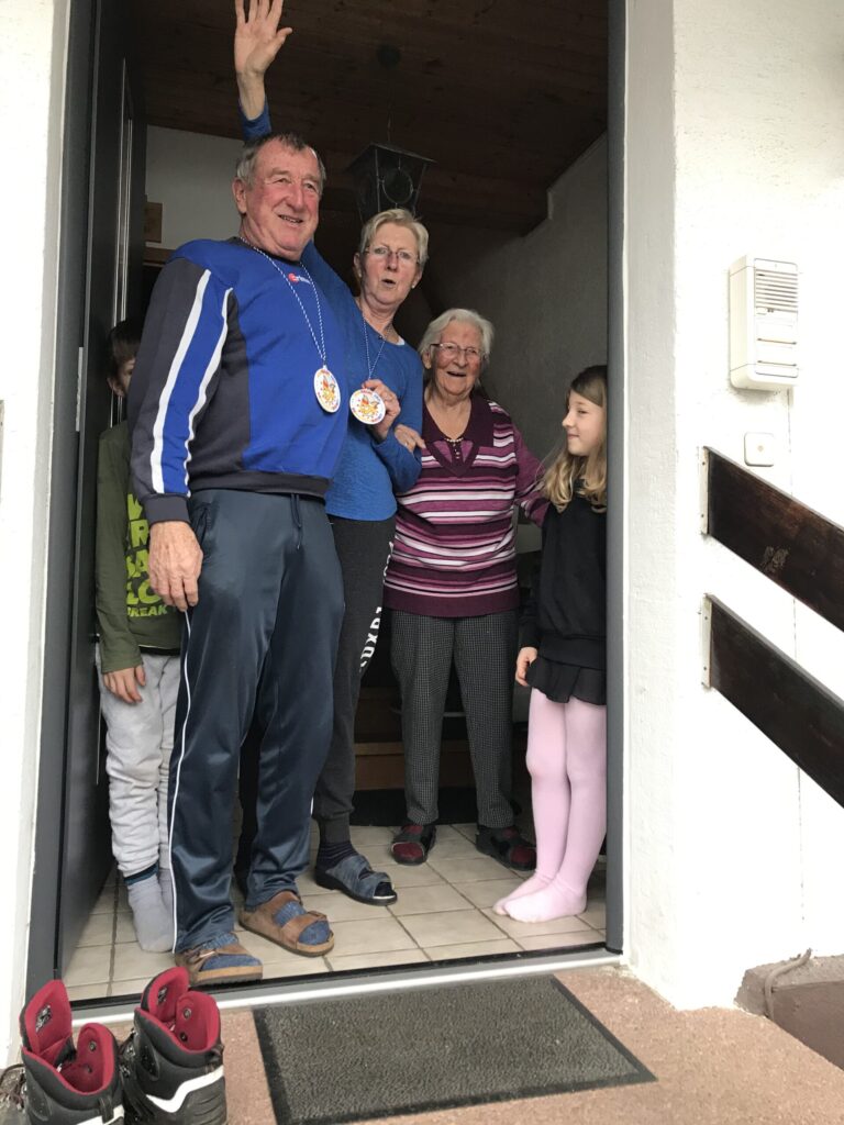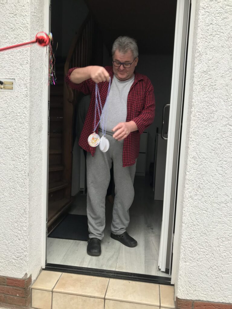 Mit viel Abstand hat dann 2021 die Fastnacht von Wohnzimmer zu Wohnzimmer unter dem Motto „Da machte was mit!“ stattgefunden. Natürlich durfte hierbei auch der obligatorische Fastnachtsorden nicht fehlen. Daher wurde eben ein Solcher eigens für dieses merkwürdige Jahr entworfen. Mit Abstand und Maske wurden diese Corona konform von der Leiterin der Abteilung Karneval -Marion Bickelhaupt- sowie dem Vereinsvorsitzenden und langjährigen Sitzungspräsidenten – Civito Carroccia- und unserer Übungsleiterin Alexandra Diehl und deren Tochter Mariella vor dem Faschingssamstag an die Mitglieder der Abteilung kontaktlos mit einem Stab überreicht. Die Resonanz auf die Haustüraktion war durchweg positiv. Alle waren total überrascht. Die Kinder und Jugendlichen bekamen zusätzlich ein kleines „Fastnacht-at-Home-Care-Paket“. Dieses bestand unter anderem aus einer roten Nase, einer kleinen Tröte und etwas Süßem. Insgesamt wurden 230 Orden verteilt. Ein großer Dank von der Abteilung gilt dem Elferratsmitglied Michael Heppenheimer, der die Orden entworfen, gefertigt und gesponsert hat.