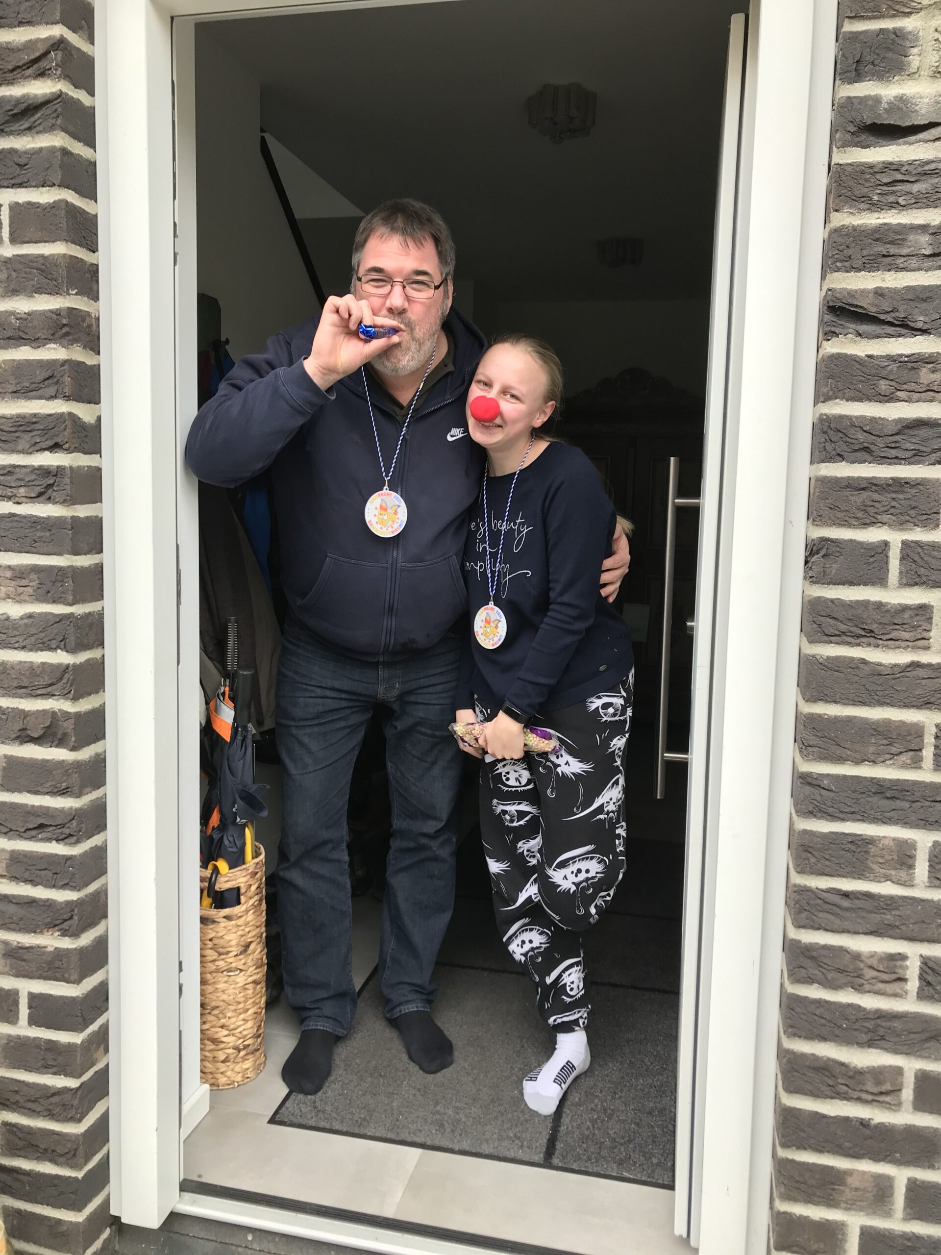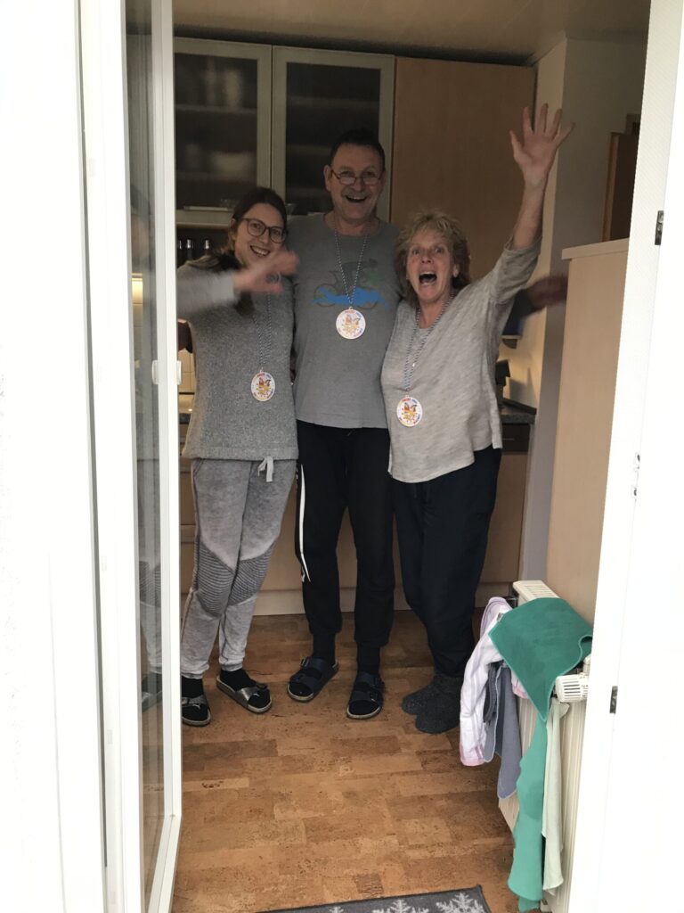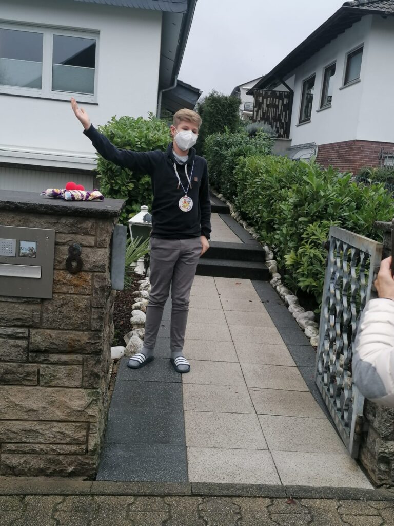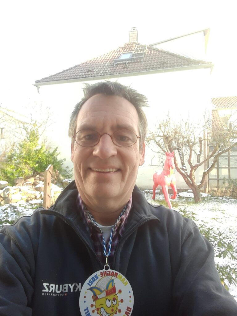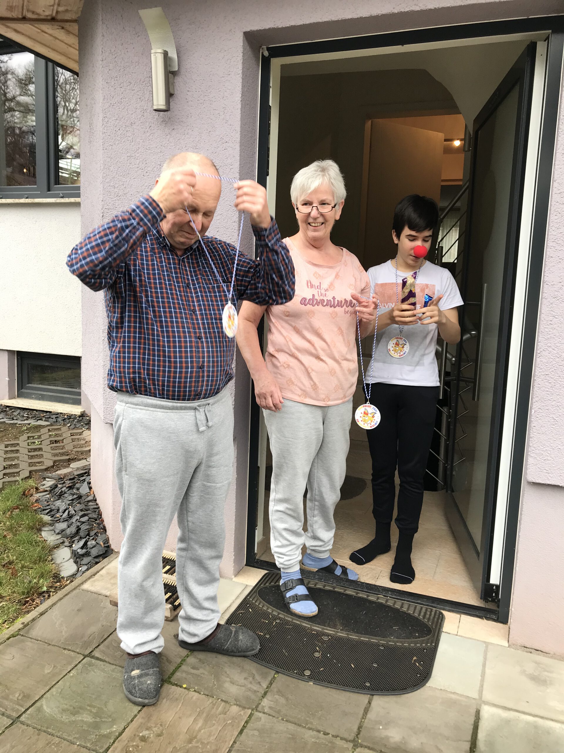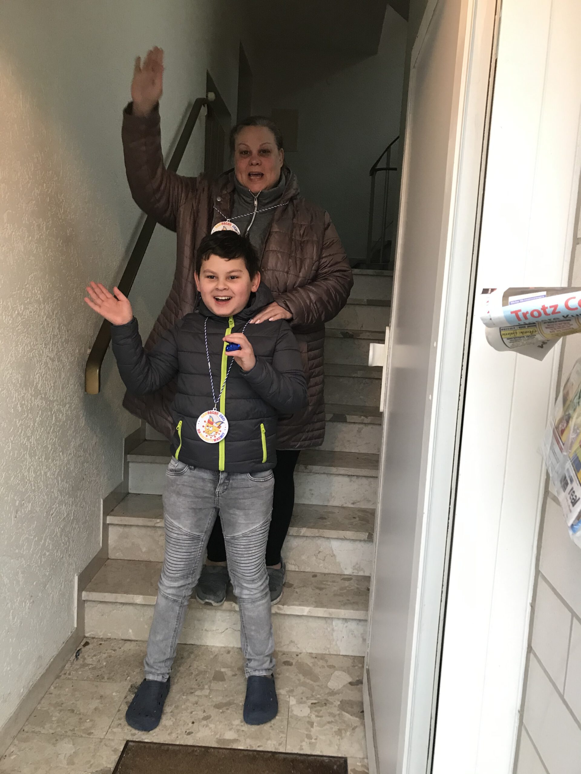 Mit viel Abstand hat dann 2021 die Fastnacht von Wohnzimmer zu Wohnzimmer unter dem Motto „Da machte was mit!“ stattgefunden. Natürlich durfte hierbei auch der obligatorische Fastnachtsorden nicht fehlen. Daher wurde eben ein Solcher eigens für dieses merkwürdige Jahr entworfen. Mit Abstand und Maske wurden diese Corona konform von der Leiterin der Abteilung Karneval -Marion Bickelhaupt- sowie dem Vereinsvorsitzenden und langjährigen Sitzungspräsidenten – Civito Carroccia- und unserer Übungsleiterin Alexandra Diehl und deren Tochter Mariella vor dem Faschingssamstag an die Mitglieder der Abteilung kontaktlos mit einem Stab überreicht. Die Resonanz auf die Haustüraktion war durchweg positiv. Alle waren total überrascht. Die Kinder und Jugendlichen bekamen zusätzlich ein kleines „Fastnacht-at-Home-Care-Paket“. Dieses bestand unter anderem aus einer roten Nase, einer kleinen Tröte und etwas Süßem. Insgesamt wurden 230 Orden verteilt. Ein großer Dank von der Abteilung gilt dem Elferratsmitglied Michael Heppenheimer, der die Orden entworfen, gefertigt und gesponsert hat.