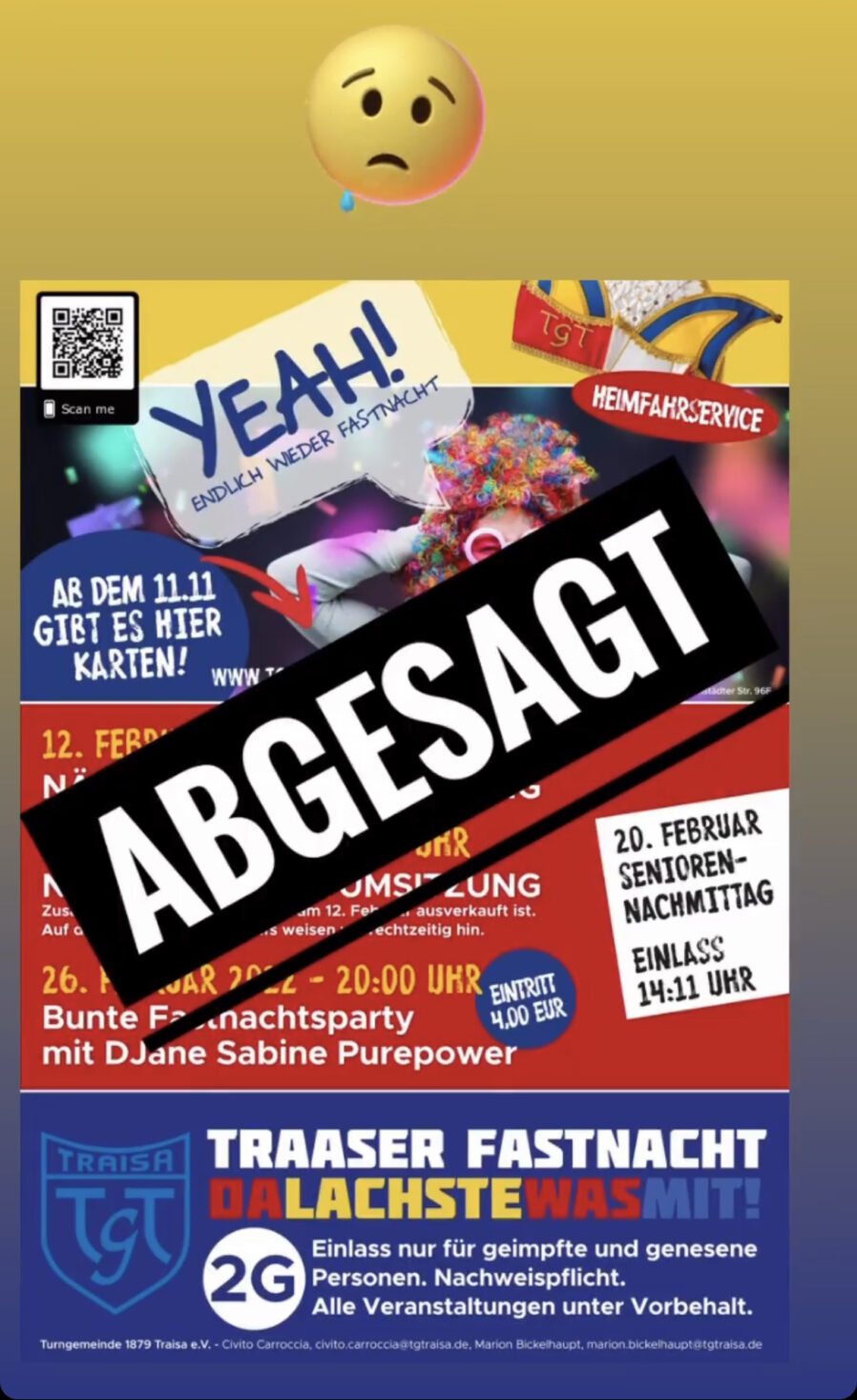 Die Corona-Infektionen schnellen weiter ungebremst in die Höhe. Aus diesem Grunde haben sich die Übungsleiter der TGT Fastnacht sowie der Vorstand der Karnevalsabteilung gemeinsam für eine Absage aller Veranstaltungen der Kampagne 2022 in der Hans-Seely-Halle entschieden. 2022 müssen wir uns alle leider noch einmal gedulden, bis wir hoffentlich zur Normalität zurückkehren, denn unsere Gesundheit ist das Wichtigste, das wir haben.